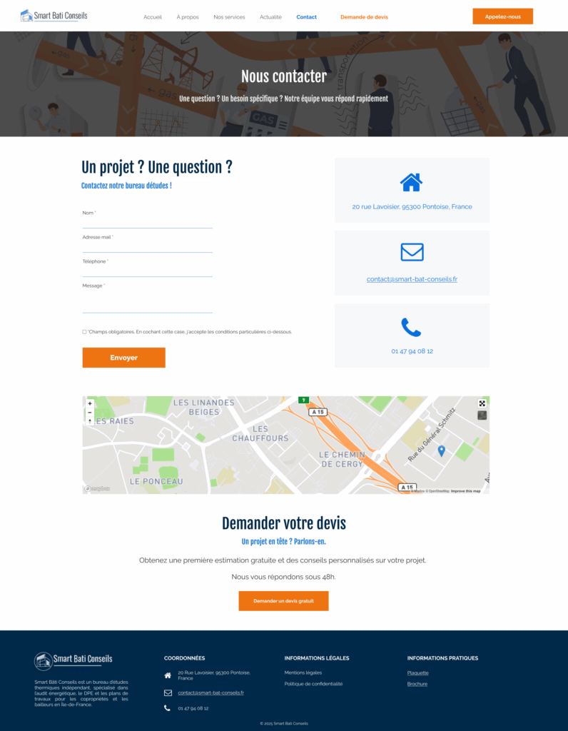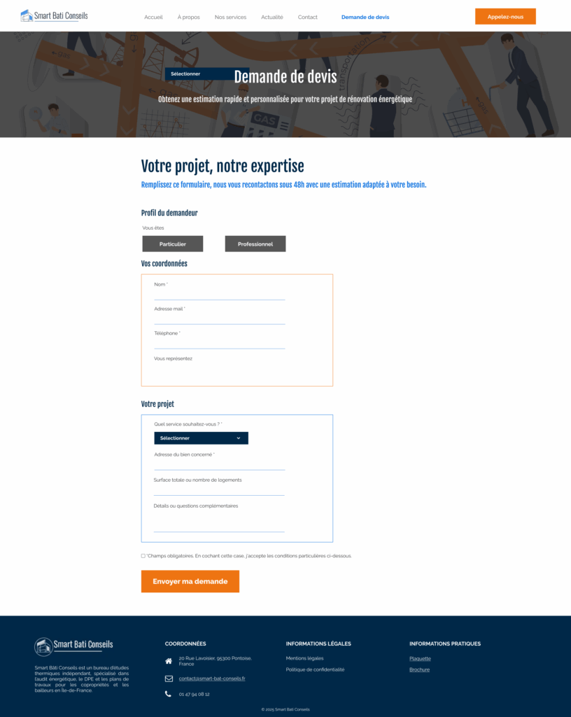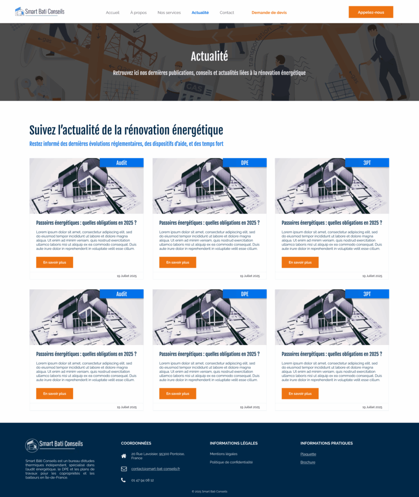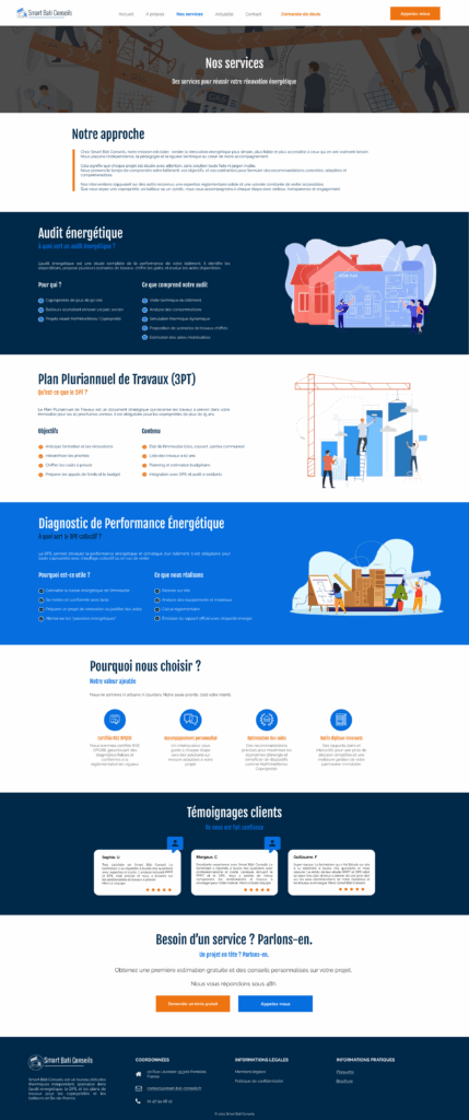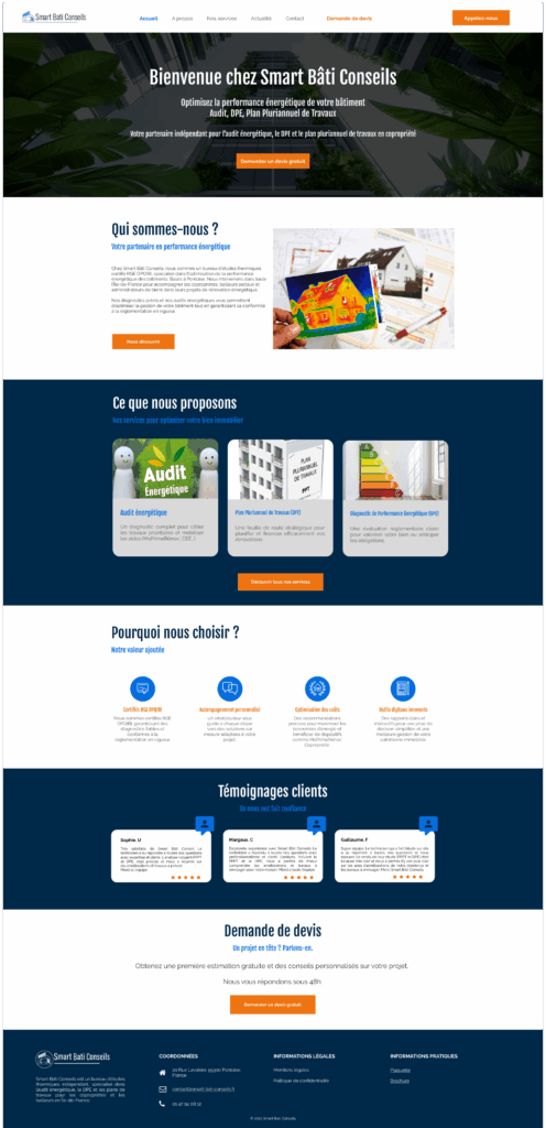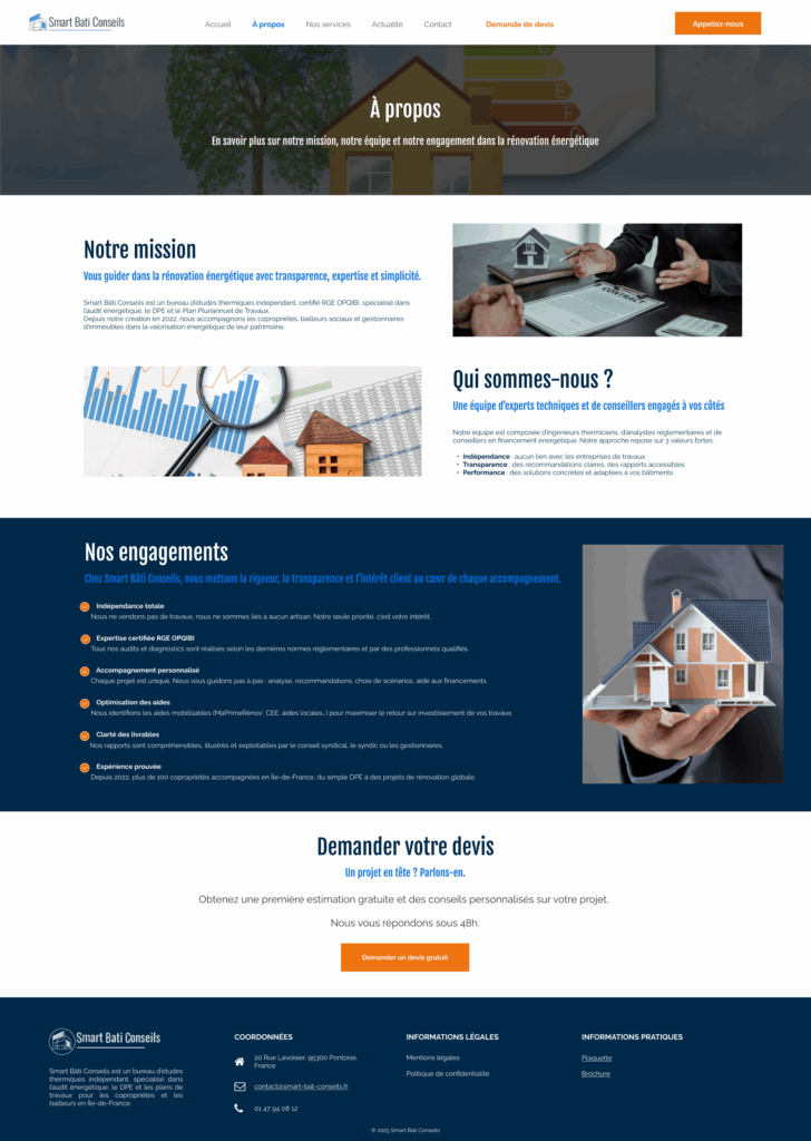 « Smart Bâti Conseils » est un bureau d’études spécialisé dans la performance énergétique des bâtiments. Son objectif est d’accompagner les particuliers, copropriétés et professionnels dans leurs projets de rénovation en réalisant des audits énergétiques, diagnostics de performance (DPE) et plans de travaux adaptés. L’idée est simple : aider chacun à mieux comprendre, maîtriser et améliorer la consommation énergétique de son bien, tout en respectant les normes en vigueur et en favorisant les économies d’énergie durables.